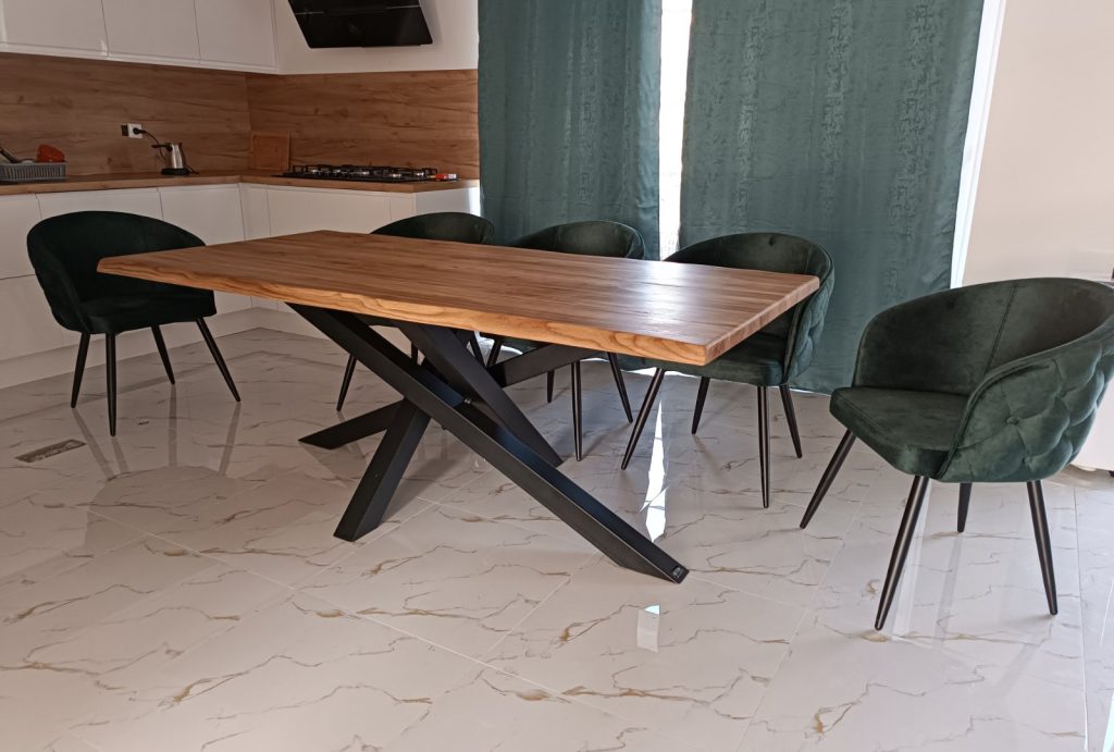 Trpezarijski sto od punog drveta, dizajniran kao centralno mjesto svakog doma. Metalna konstrukcija stola je plastificirana i izrađena u našoj vlastitoj proizvodnji, uz mogućnost potpunog izbora boje konstrukcije prema vašem enterijeru. Ploča stola je moderna, masivna i ručno izrađena od prirodnog punog drveta hrasta ili oraha. Svaki trpezarijski sto je 100% ručno izrađen i obrađen, od pažljivo biranih i kvalitetno osušenih komada drveta. Kroz cijeli proces izrade prolazimo zajedno s vama – od prve ideje do finalnog proizvoda. Završna zaštita ploče vrši se visokokvalitetnim RUBIO uljem, koje sprječava upijanje tekućina i nastanak mrlja, dok prirodan izgled i struktura drveta ostaju u potpunosti očuvani.